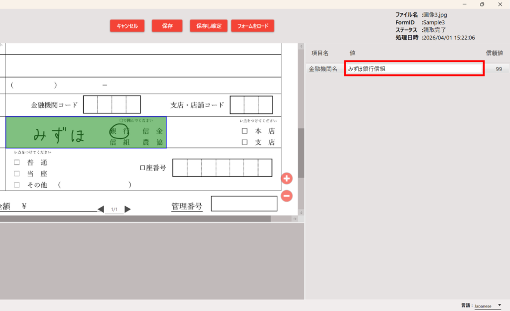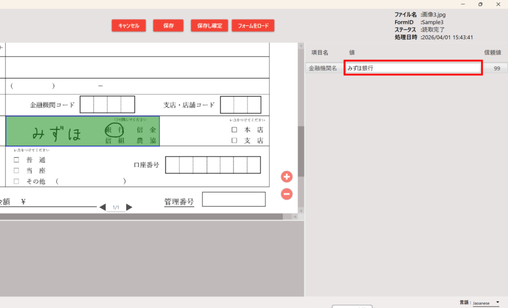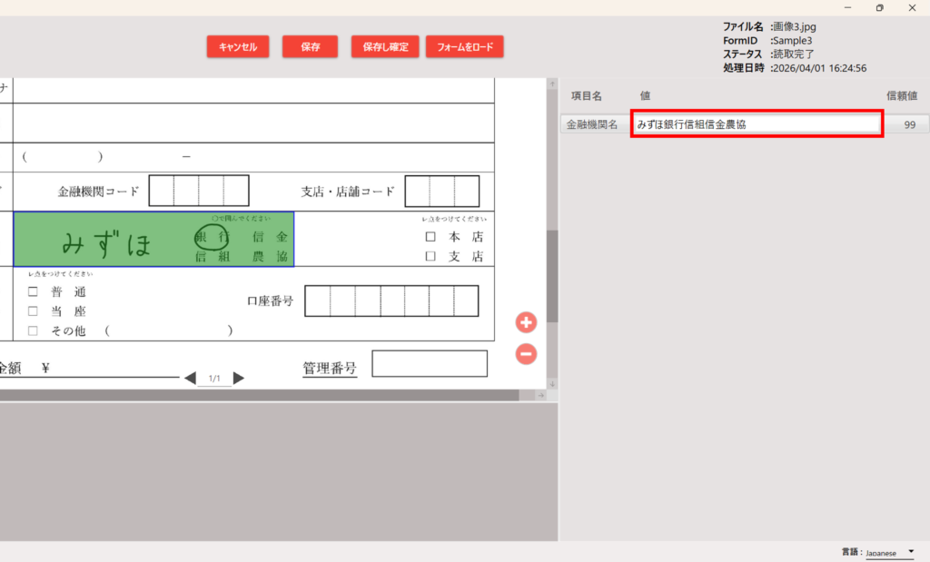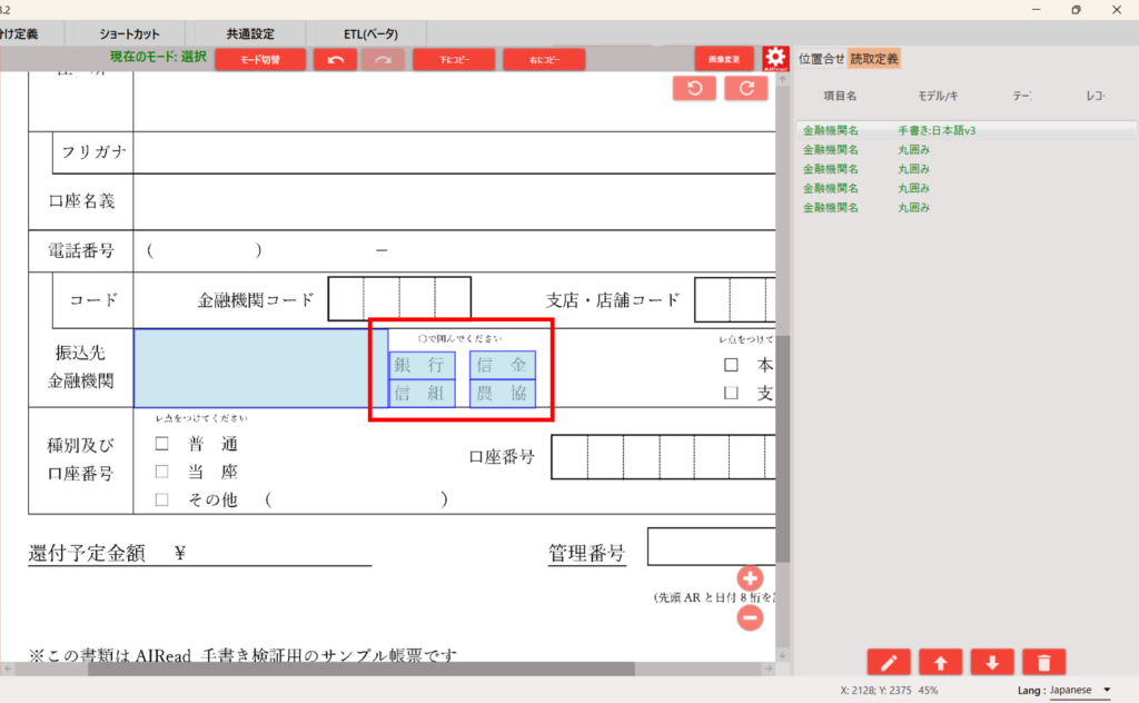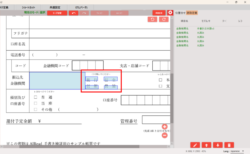 下の画像のような選択範囲設定し、記入された帳票を読み取った結果「銀行」と「信組」が両方出力されてしまいました。