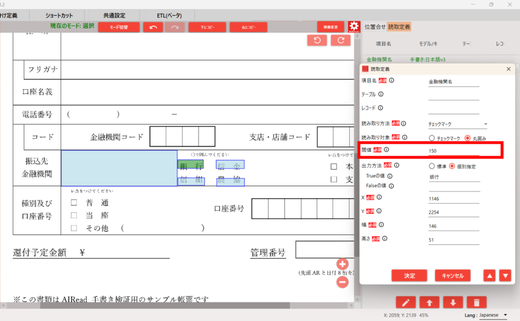 下の画像のようにすべての丸囲みの項目の閾値を「150」に設定して読取を行うと、丸のついた「銀行」のみが出力されました。