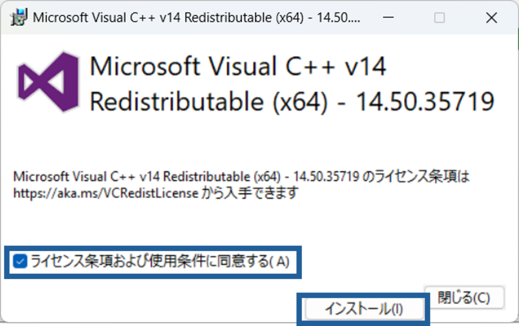 Microsoft Visual C++ v14インストール完了後は必ず、「閉じる」ボタンで終了してください。