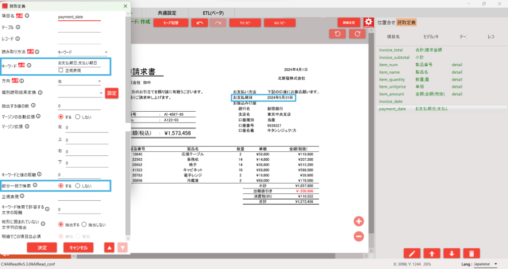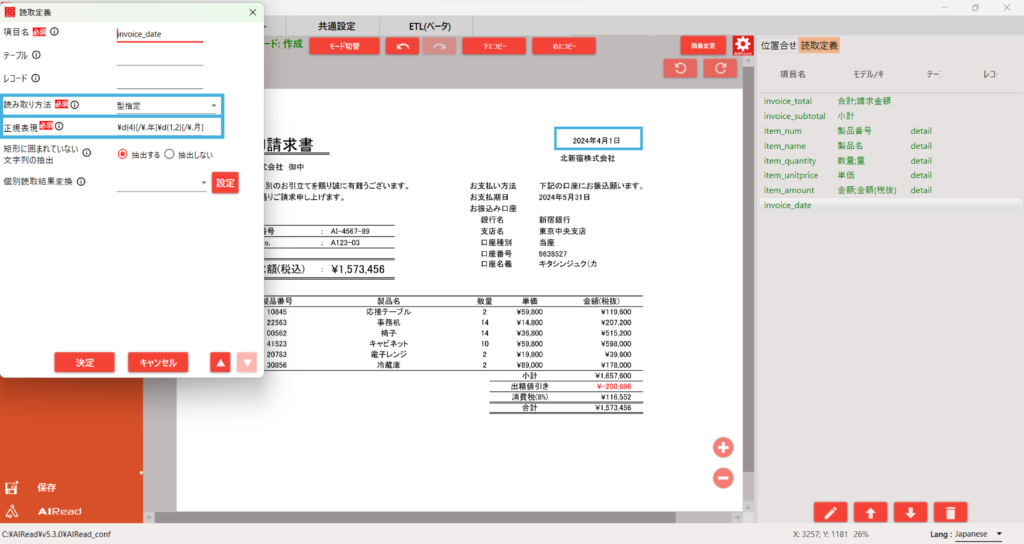 上記は「invoice_date」の読取設定です。