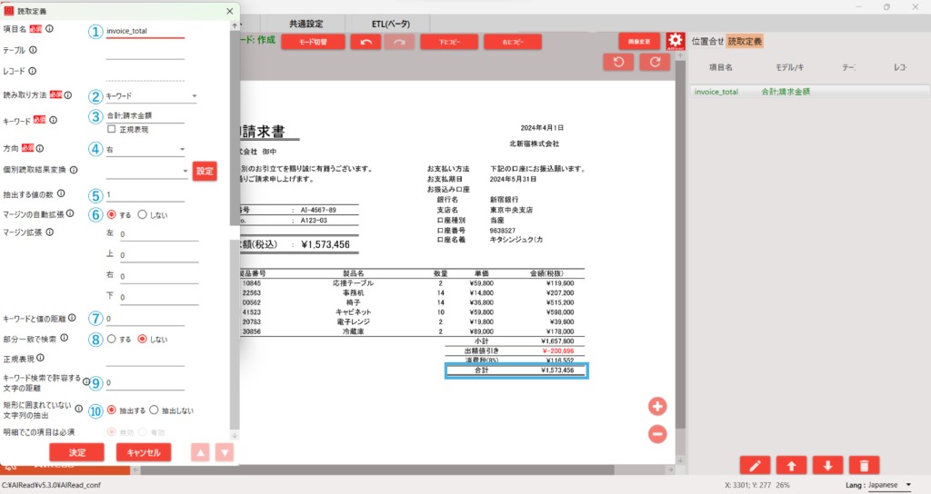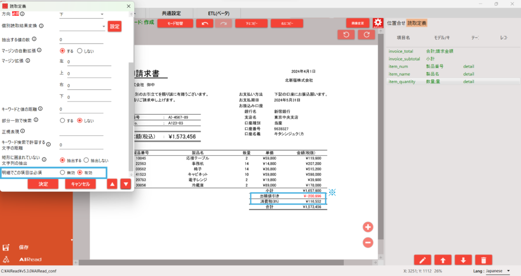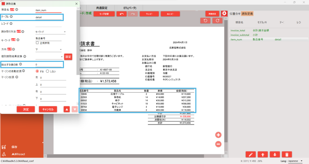 同じ読取設定で「製品名、数量、単価、金額」も設定していきます。