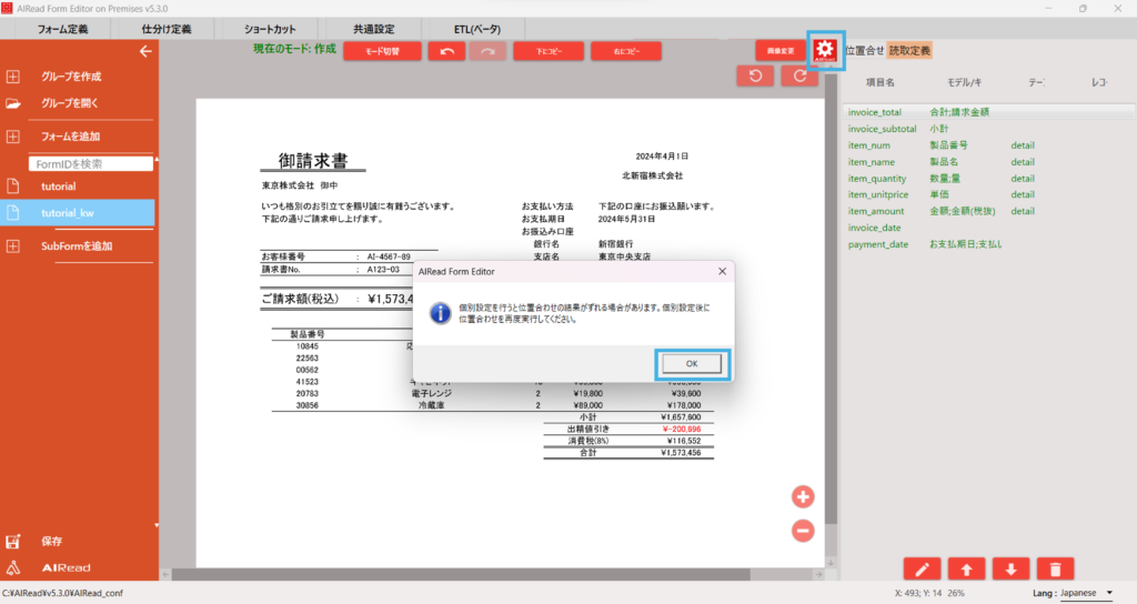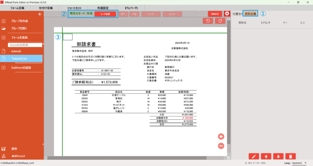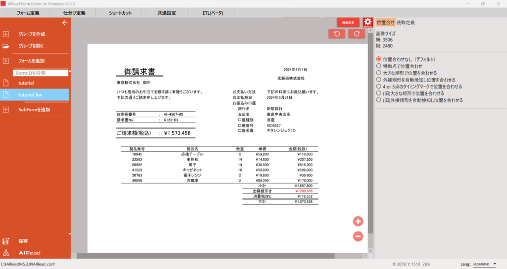 AIRead FormEditor を使用して読取定義がキーワード指定の帳票定義を作成します。