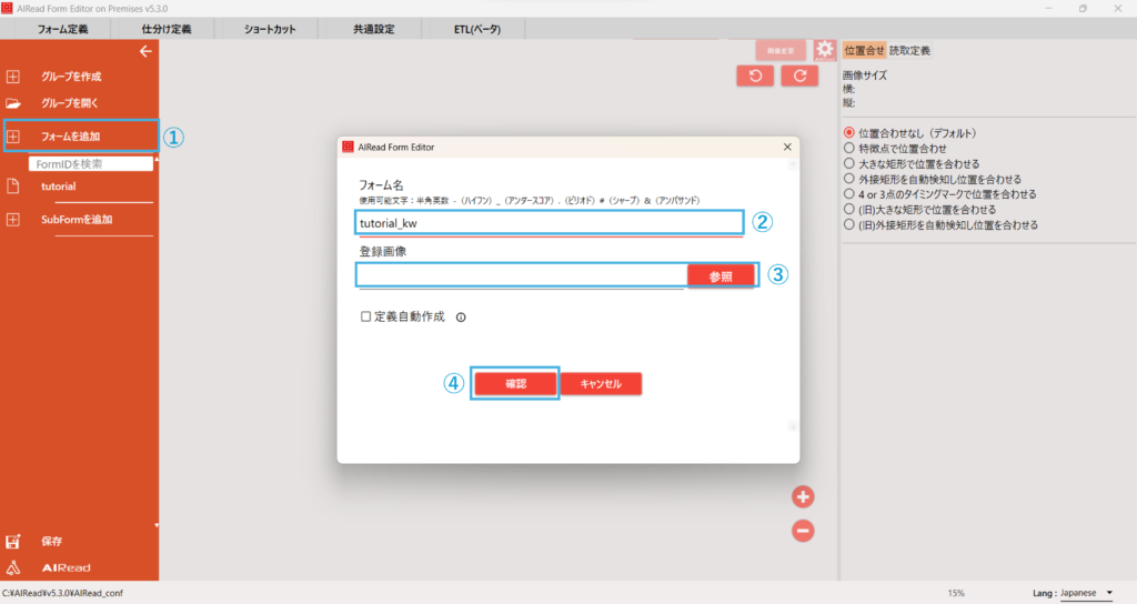 ②フォーム名に任意のフォーム名を入力します。今回は「tutorial_kw」と入力します。