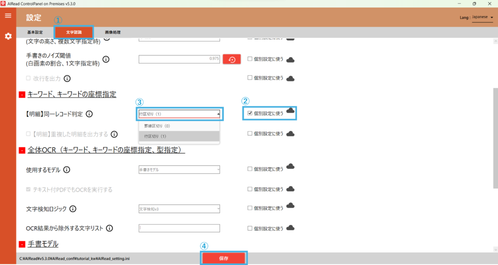個別設定とは帳票定義ごとに個別でOCRの設定をすることができます。