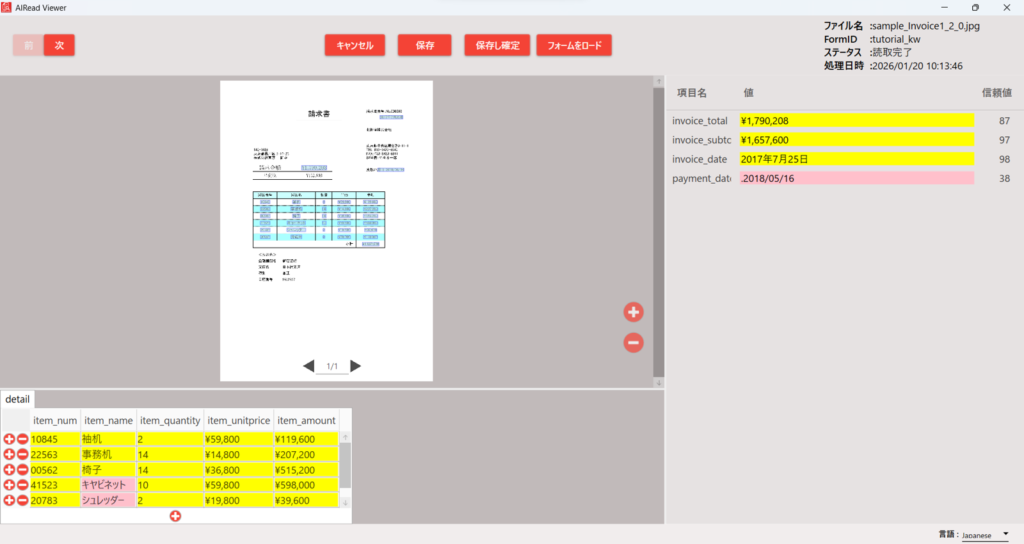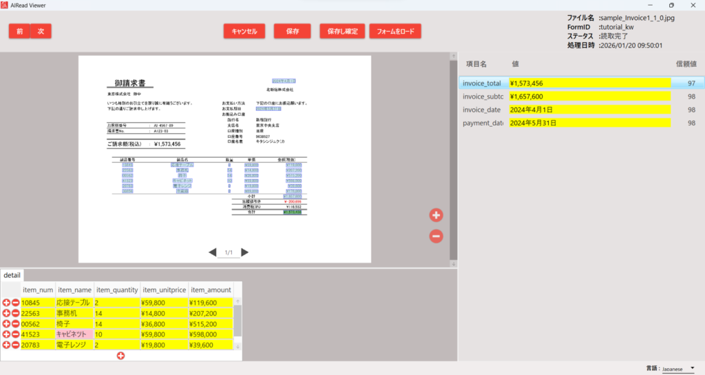 先ほどの読取結果の「詳細」ボタンをおして詳細確認と編集をします。