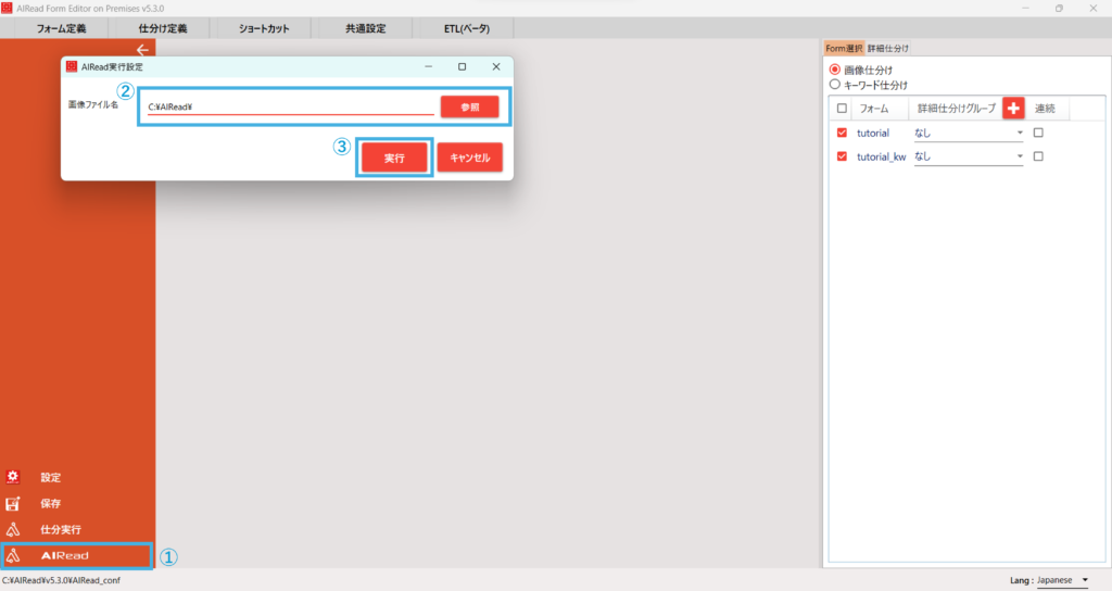 ①仕分け定義画面から左下のAIReadボタンを押下します。