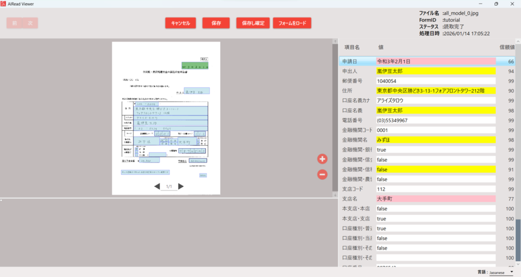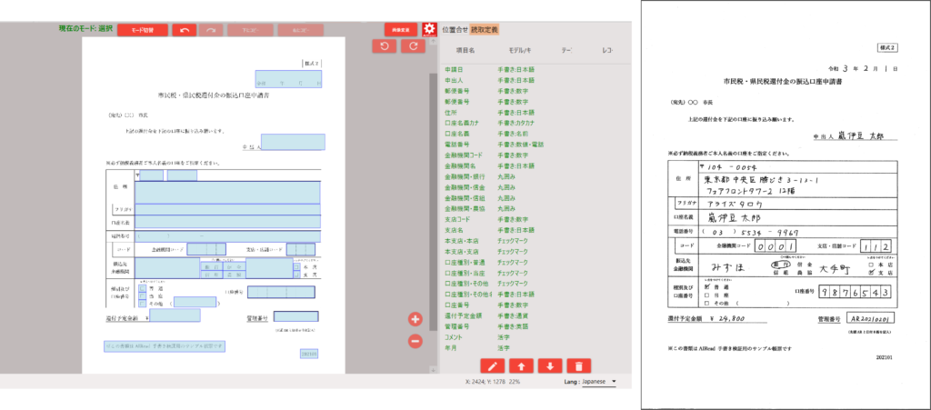 チュートリアルの帳票定義作成:座標指定で作成した定義でサンプル画像を読み取ります。