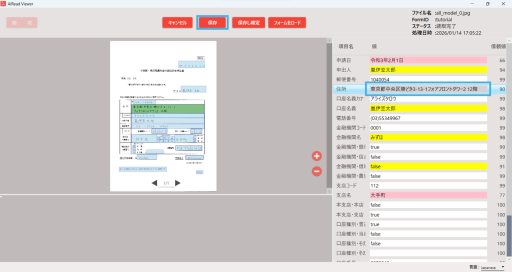 この画面で読取結果を編集することが可能です。