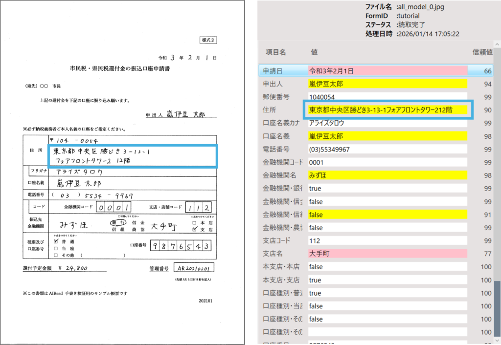 | "ItemName","Page","GID","RID","Value","conf","x","y","w","h","TableName","is_update" "modifyDate","-1","-1","-1","2026-01-14T17:05:46","-1","-1","-1","-1","-1","-1","0" "processDate","-1","-1","-1","2026-01-14T17:05:22","-1","-1","-1","-1","-1","-1","0" "result","-1","-1","-1","true","-1","-1","-1","-1","-1","-1","0" "group_name","-1","-1","-1","AIRead_conf","-1","-1","-1","-1","-1","-1","0" "form_id","-1","-1","-1","tutorial","-1","-1","-1","-1","-1","-1","0" "Image","-1","-1","-1","all_model_0.jpg","-1","-1","-1","-1","-1","-1","0" "Image_jshfilename","-1","-1","-1","C:\AIRead\v5.3.0\FormEditor\work\20260114_170520\output\all_model_0.jpg","-1","-1","-1","-1","-1","-1","0" "申請日","0","","-1","令和3年2月1日","66","1596","463","609","163","","0" "申出人","0","","-1","嵐伊豆太郎","94","1649","1046","586","149","","0" "郵便番号","0","","-1","1040054","99","537","1372","527","102","","0" "住所","0","","-1","東京都中央区勝どき3-13-1フォアフロントタワー2 12階","90","495","1475","1695","212","","1" "口座名義カナ","0","","-1","アライズタロウ","99","493","1684","1699","108","","0" "口座名義","0","","-1","嵐伊豆太郎","98","493","1784","1700","127","","0" "電話番号","0","","-1","(03)55349967","99","495","1928","1697","111","","0" "金融機関コード","0","","-1","0001","99","968","2042","359","114","","0" "金融機関名","0","","-1","みずほ","98","493","2172","597","196","","0" "金融機関・銀行","0","","-1","true","99","1095","2212","204","81","","0" "金融機関・信金","0","","-1","false","99","1296","2212","214","86","","0" "金融機関・信組","0","","-1","false","91","1095","2292","203","77","","0" "金融機関・農協","0","","-1","false","99","1296","2293","214","78","","0" "支店コード","0","","-1","112","99","1878","2047","266","113","","0" "支店名","0","","-1","大手町","77","1506","2180","436","189","","0" "本支店・本店","0","","-1","false","100","1943","2227","64","71","","0" "本支店・支店","0","","-1","true","100","1943","2297","64","71","","0" "口座種別・普通","0","","-1","true","100","525","2420","73","71","","0" "口座種別・当座","0","","-1","false","100","525","2490","73","71","","0" "口座種別・その他","0","","-1","false","100","525","2558","73","72","","0" "口座種別・その他名","0","","-1","","100","848","2532","391","99","","0" "口座番号","0","","-1","9876543","99","1525","2438","614","111","","0" "還付予定金額","0","","-1","24,800","98","626","2641","466","123","","0" "管理番号","0","","-1","AR20210z0l","35","1768","2671","400","92","","0" "コメント","0","","-1","※この書類は AIRead 手書き検証用のサンプル帳票です","98","210","2934","1109","107","","0" "年月","0","","-1","202101","98","2005","3013","165","89","","0" |
